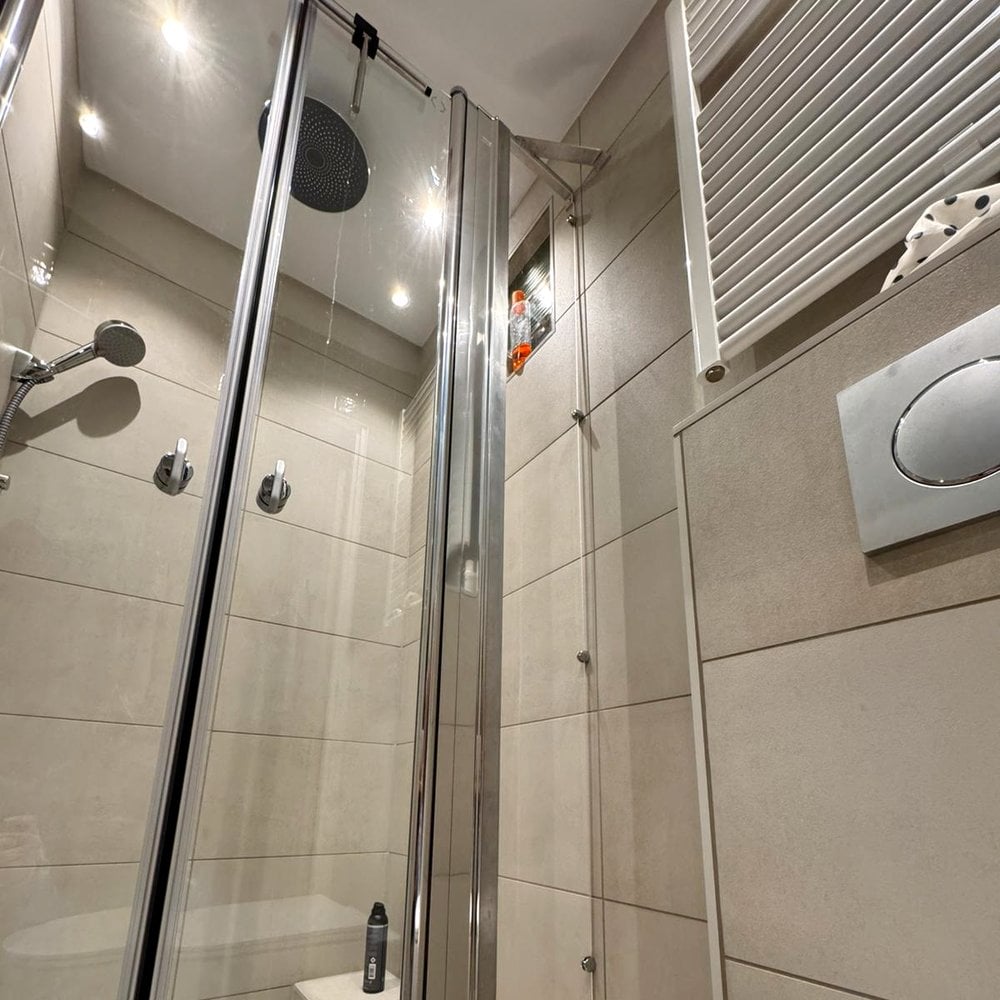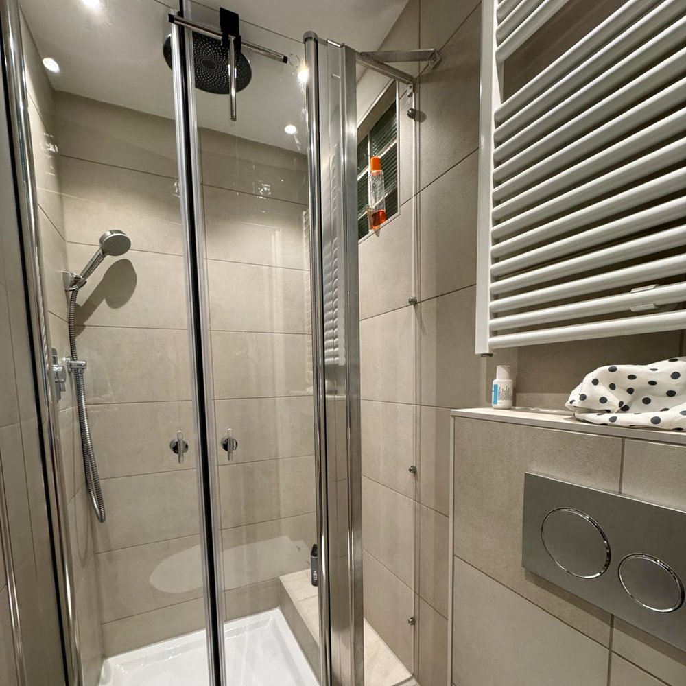 Jacqueline renoveerde haar kleine jaren ’40 appartement naar een moderne woning. Na het slopen van een tussenwand en het maken van een uitbreiding in de badkamer ontstond er een lastige situatie. Door een langwerpig blok op de vloer kon de douchecabine niet volledig afgesloten worden – er bleef een ‘gat’ over tussen de douchedeur en de muur.