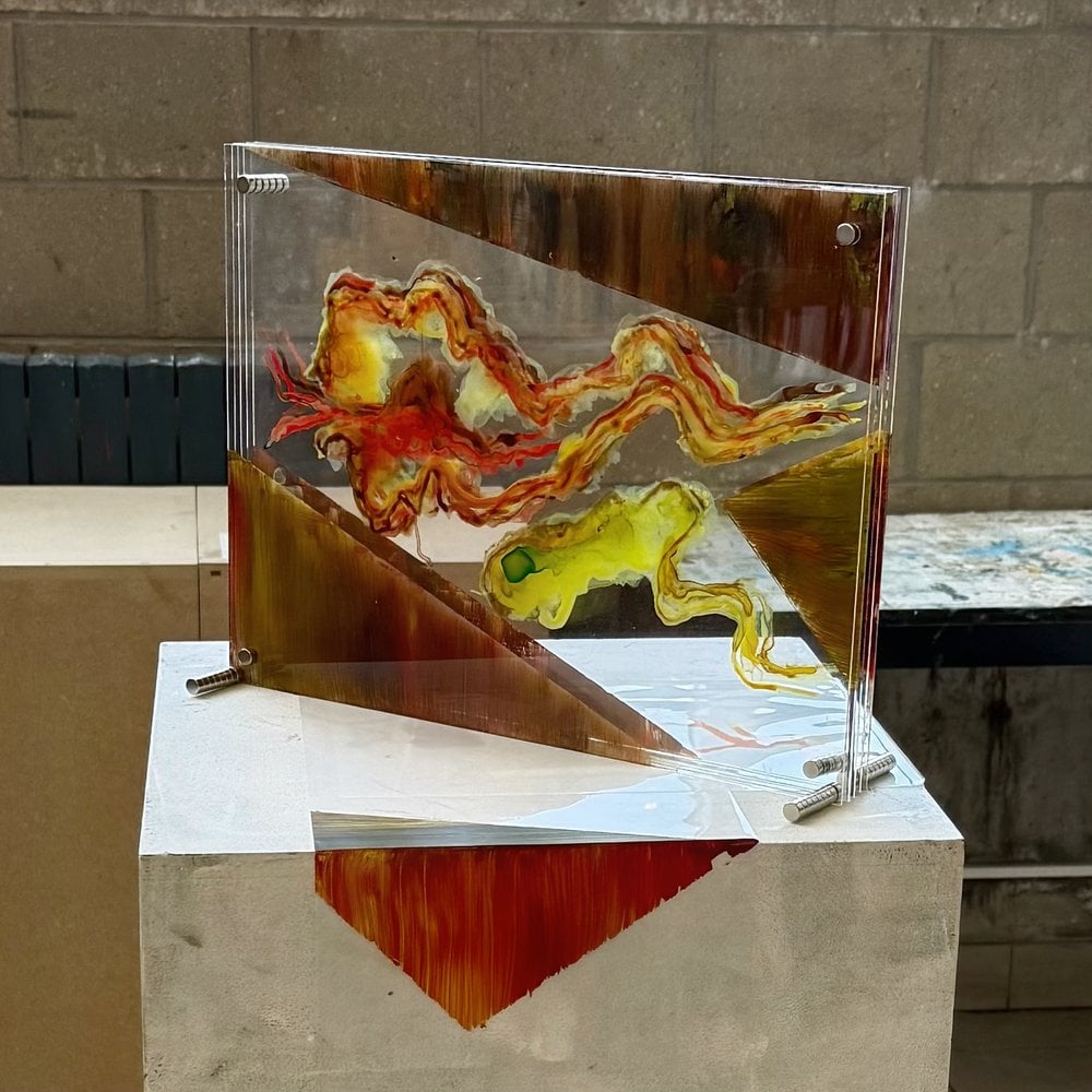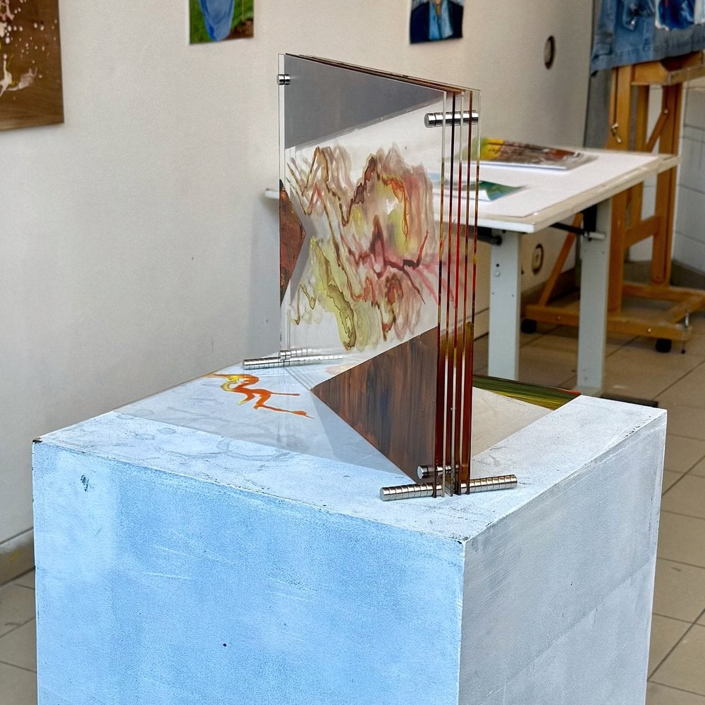 Christl Van den Broucke uit Beveren maakte iets bijzonders: een driedimensionaal schilderij van vijf heldere plexiglas platen. Door op meerdere transparante lagen te schilderen ontstond er diepte en beweging in haar kunstwerk. Een creatieve manier om plexiglas te gebruiken als canvas in plaats van doek of papier.