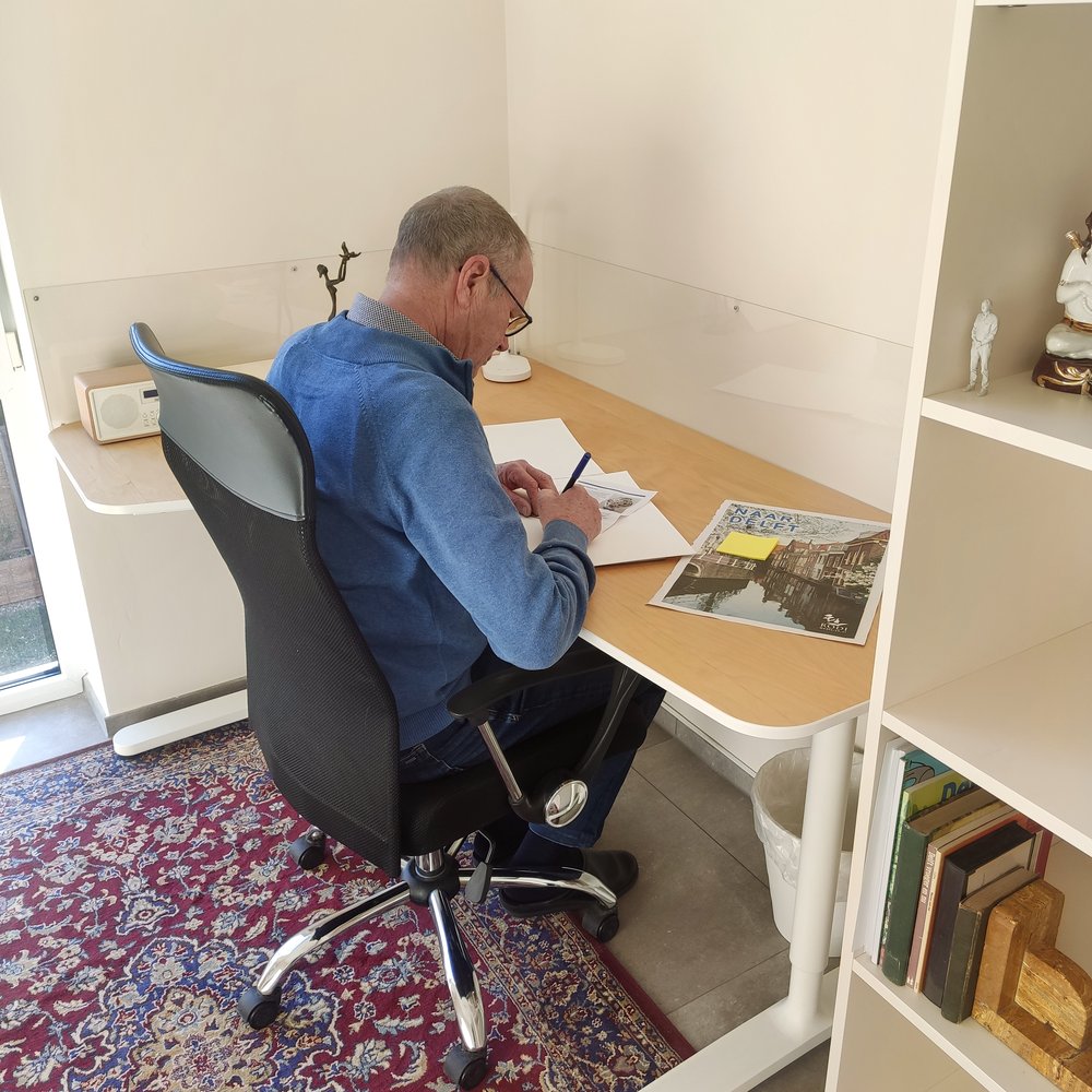Na een verhuizing van een groot huis naar een appartement stond Henk Petermeijer uit Delft voor een uitdaging. Zijn nieuwe atelier was een stuk kleiner dan zijn oude, maar zijn creativiteit moest wel door kunnen gaan. Om zijn wanden te beschermen tegen vuil en verfspatten, bevestigde hij slimme kunststof platen aan de muren. Een praktische oplossing die ervoor zorgt dat hij gewoon lekker kan kliederen zonder zich zorgen te maken over zijn appartement.