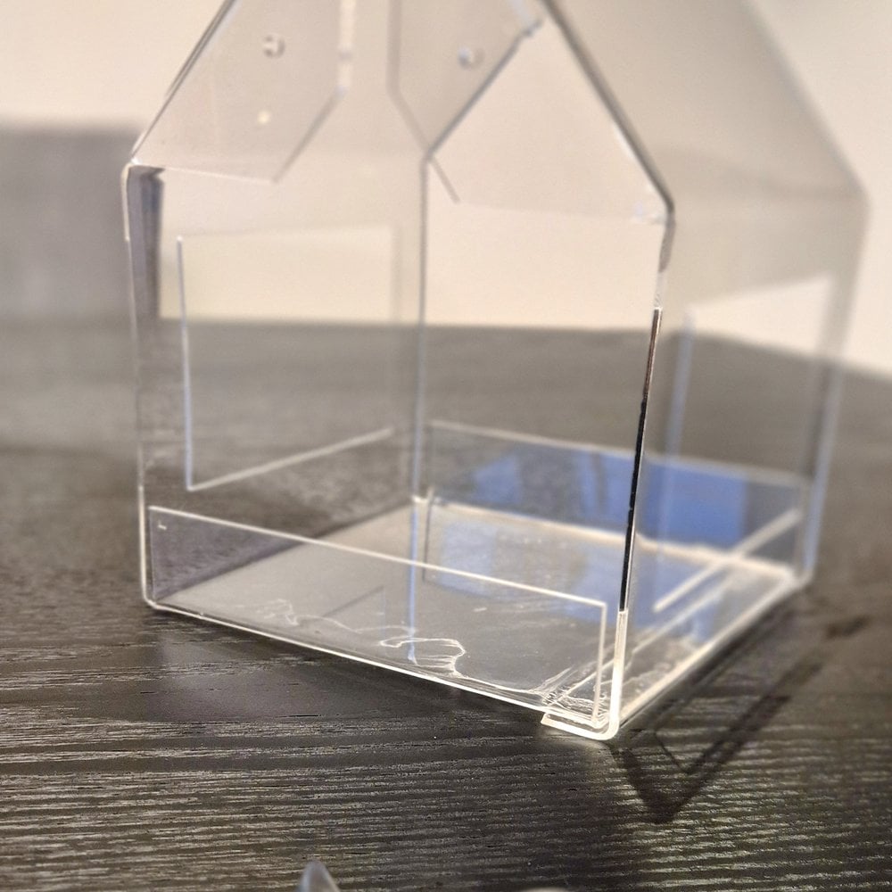 AJ heeft een doorzichtig vogelhuisje gemaakt van 2 mm dik plexiglas. Het bijzondere aan dit huisje is dat je het gewoon tegen je raam kunt plakken. Door het transparante materiaal kun je precies zien wat de vogels doen. Het huisje wordt gemaakt door het plexiglas te verwarmen en te buigen, waarna je alles aan elkaar plakt.