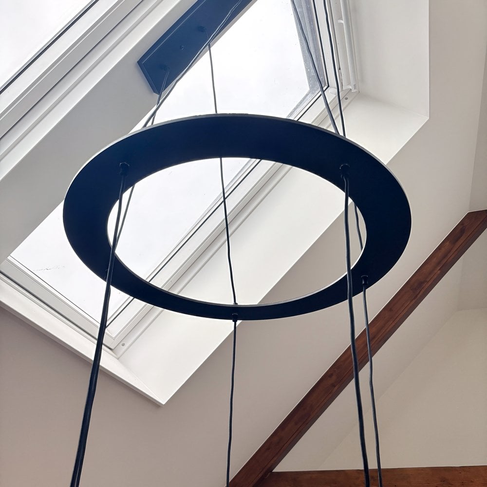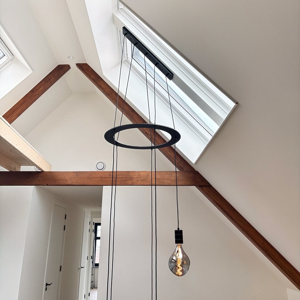 Het slimme aan dit ontwerp? De cirkel compenseert de hoek van het dak volledig. “Om de hoek van het dak op te vangen zijn in deze cirkel 5 dubbele kabel wartels gemonteerd waardoor het mogelijk is om de textiel kabel af te klemmen en de lampen en de cirkel recht te laten hangen,” legt Ronald uit.