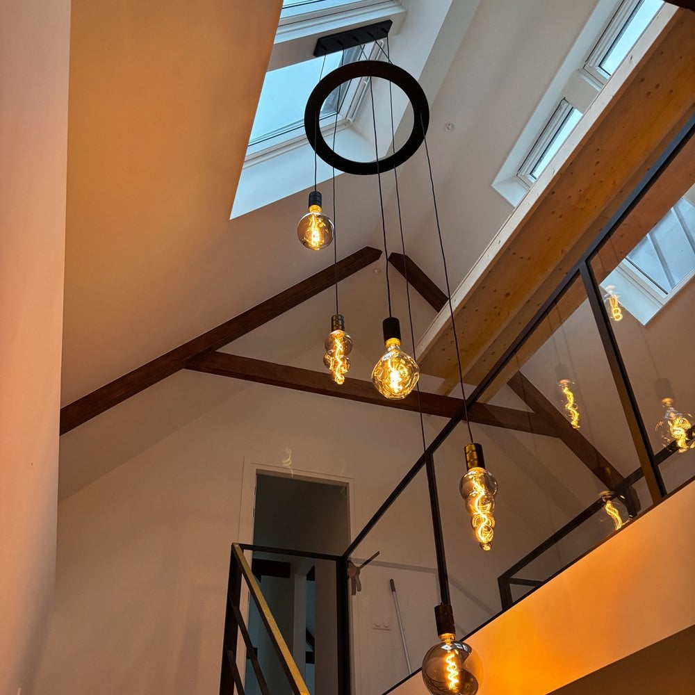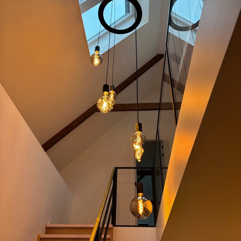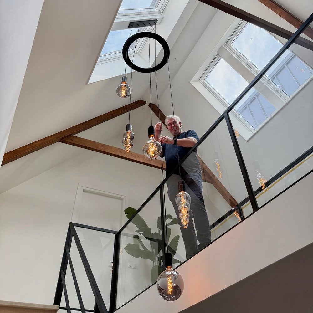 Ronald creëerde een vijfarmige vidélamp die precies boven de trap hangt. De lamp bestaat uit een zwarte HPL cirkel met vijf E27 fittingen die via textielsnoeren verbonden zijn. Door dubbele kabelwartels gebruikt te maken, hangen alle lampen mooi recht ondanks het schuine dak.