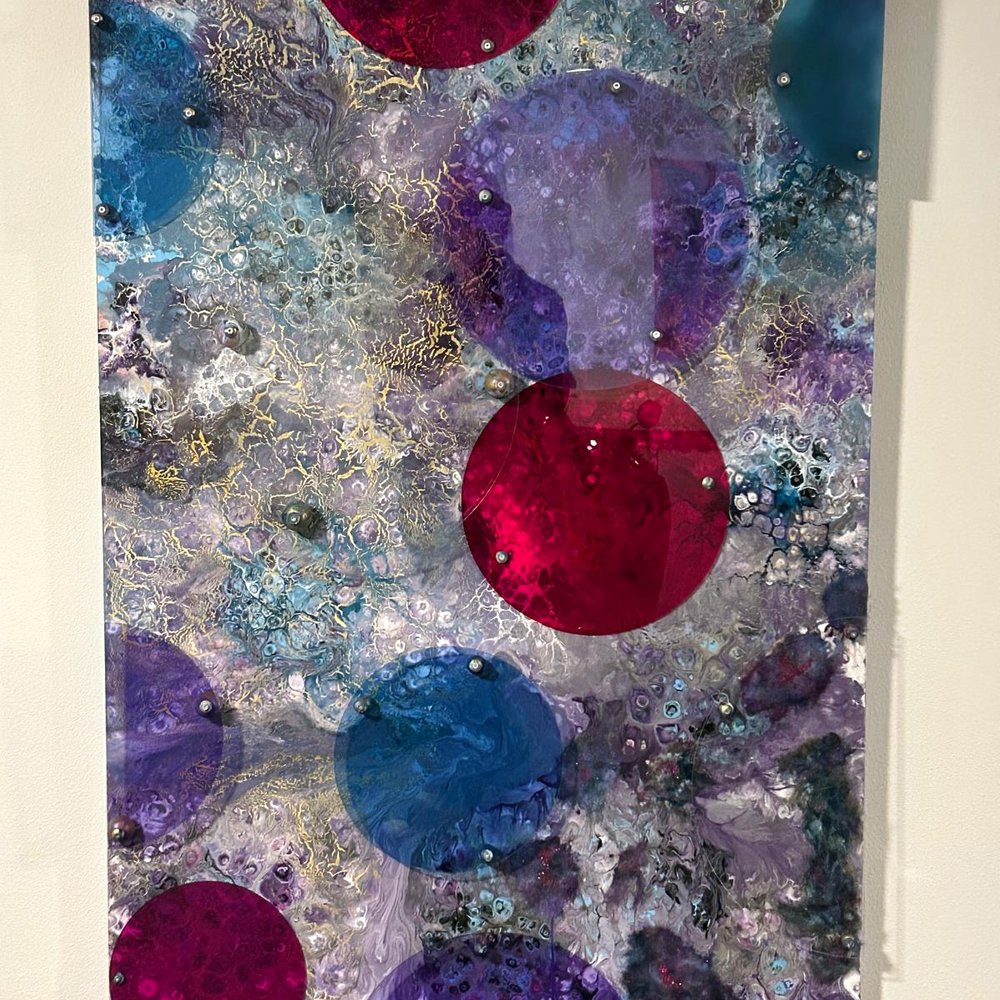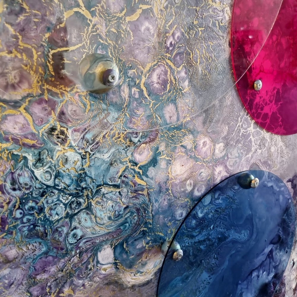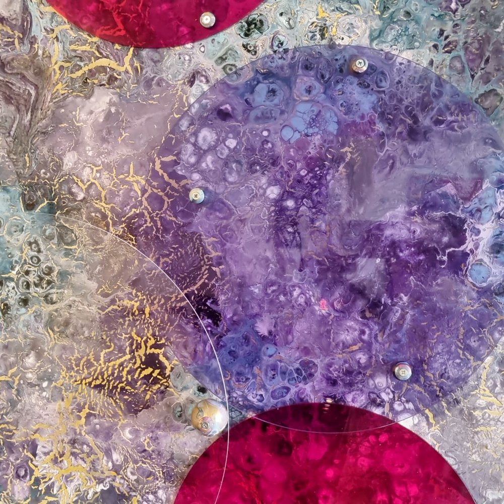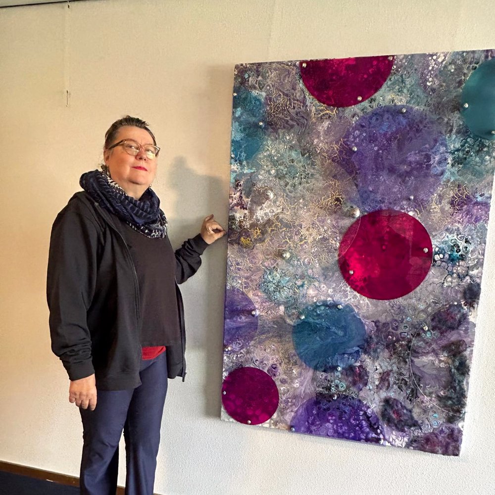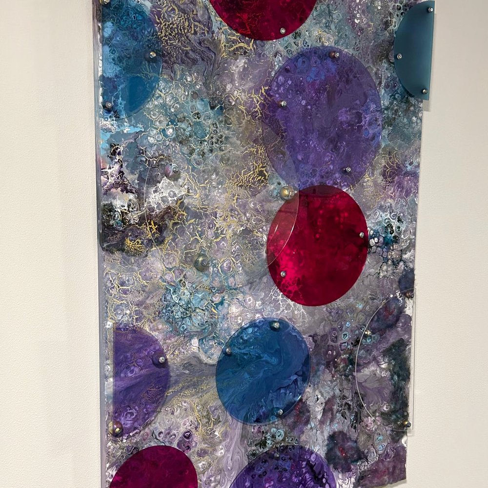 Kunstenares Annette uit Papendrecht heeft iets bijzonders gemaakt: een groot wandkunstwerk van 100 x 150 cm waarin plexiglas de hoofdrol speelt. Ze combineerde schilderkunst met transparante en gekleurde plexiglas cirkels en halve cirkels om een ruimtelijk effect te creëren. Het resultaat is een kunstwerk dat verandert met het licht en de kijkhoek.