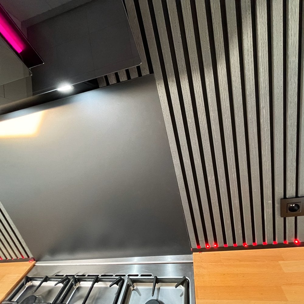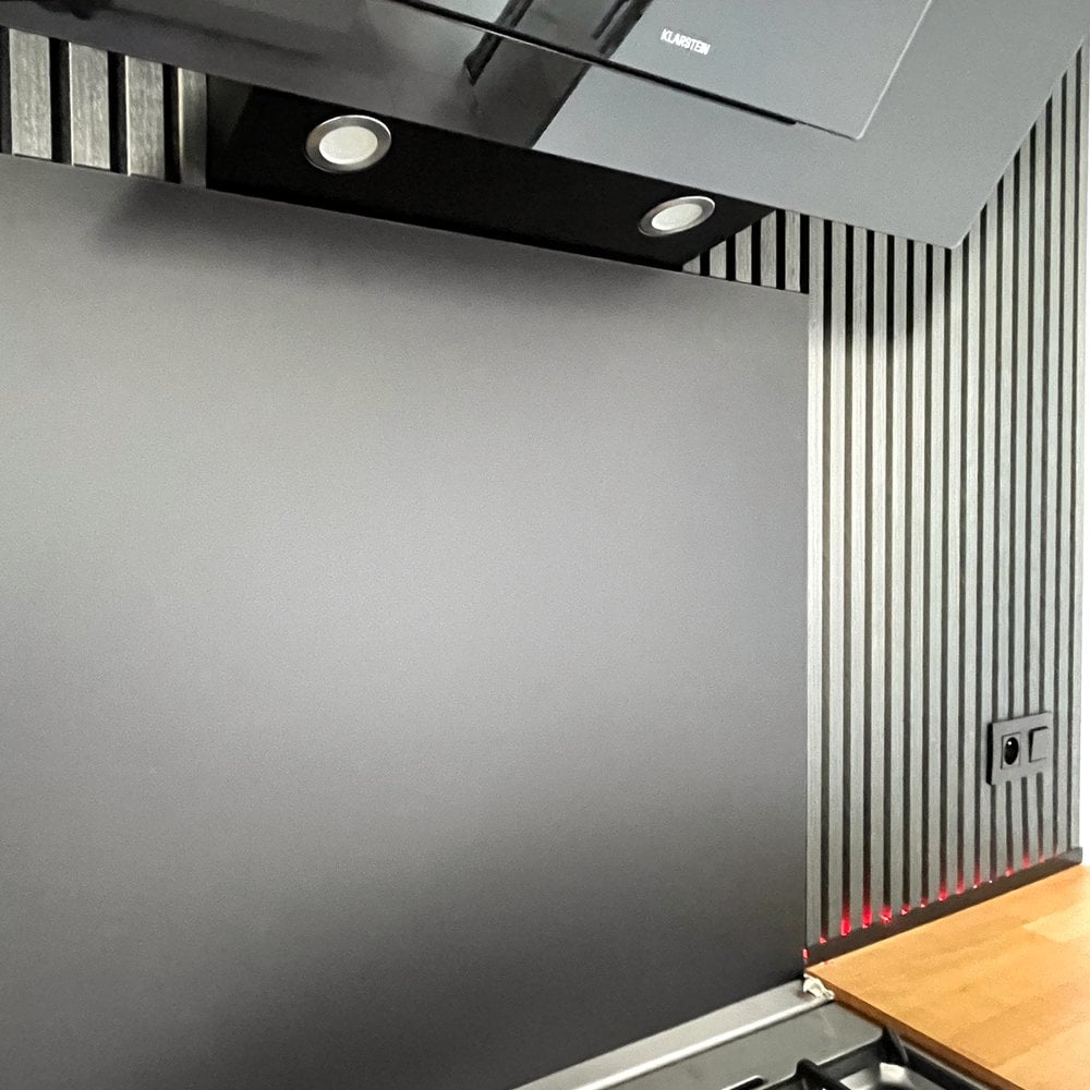 Christophe Van Acker uit Zelzate gaf zijn witte keuken een complete make-over. Van een saaie witte muur met goedkope dampkap naar een luxe zwarte keuken die je zo in een designtijdschrift ziet staan. Het geheim? Een matzwarte spatwand van kunststofplatenshop.nl als finishing touch, gecombineerd met slimme wandbekleding en sfeervolle ledverlichting.
