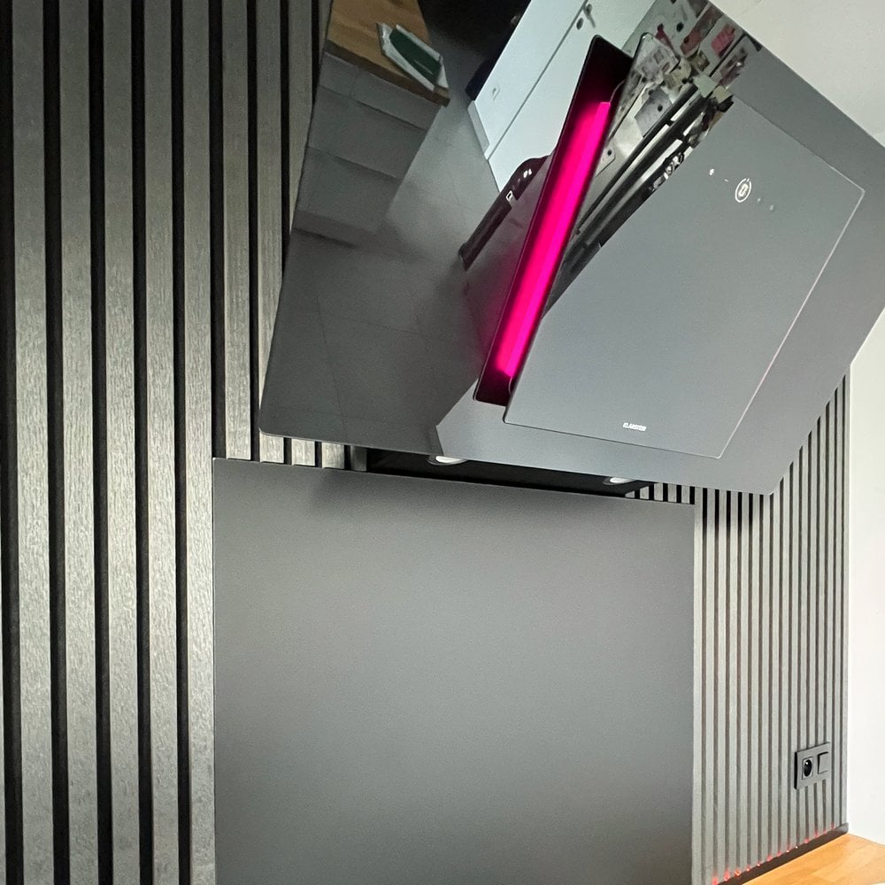 Christophe pakte zijn keuken grondig aan. De oude witte muur verdween onder een laag zwarte houten wandbekleding. Een nieuwe dampkap verving het oude goedkope exemplaar. Het keukenblad kreeg uitgeboorde gaten voor meerkleurige ledverlichting die voor sfeer zorgt. Kunststof hoekprofielen zorgen voor een nette afwerking en beschermen tegen vuil en voedselresten. De stopcontacten kregen matzwarte frontjes en als klap op de vuurpijl kwam er een matzwarte spatwand bij.