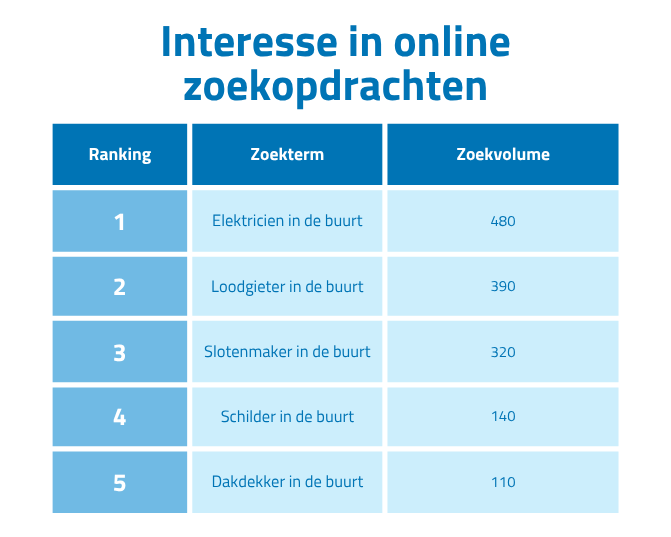 Termen als ‘stukadoor bij mij in de buurt’ en ‘tuinman bij mij in de buurt’ worden daarentegen veel minder vaak gezocht, met gemiddeld 40 en 50 zoekopdrachten per maand.