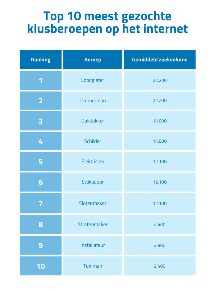 Loodgieters en timmermannen zijn de meest gezochte vakmensen op het internet. Met een gemiddelde van 22.000 zoekopdrachten per maand, zijn het online allebei populaire beroepen. Niet zo gek natuurlijk, want een verstopping of grote verbouwing wil je snel aanpakken. Ook dakdekkers, schilders en elektriciens zijn populair en maken de top vijf compleet. Benieuwd naar de rest van de top 10? Bekijk de visual hieronder!