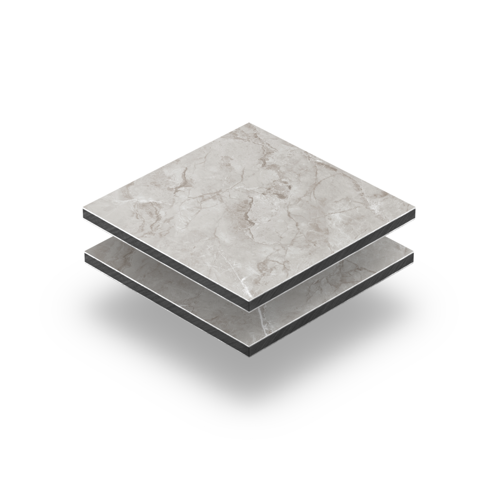 Deze grijs marmer gekleurde Alupanel sandwichplaat bestaat uit een polyethyleen kern en twee toplagen van 0,3 millimeter dik aluminium. Deze toplagen zijn zeer duurzaam en verdragen diverse chemicaliën als zuren, basen, oliën en sterke oplosmiddelen. Aluminium composiet platen kunnen uitzetten of krimpen bij wisselende temperaturen. Je kunt de plaat gebruiken in temperaturen van -40°C tot +80°C. De plaat zet 0,24 mm per strekkende meter uit wanneer de plaat 10 graden opwarmt.