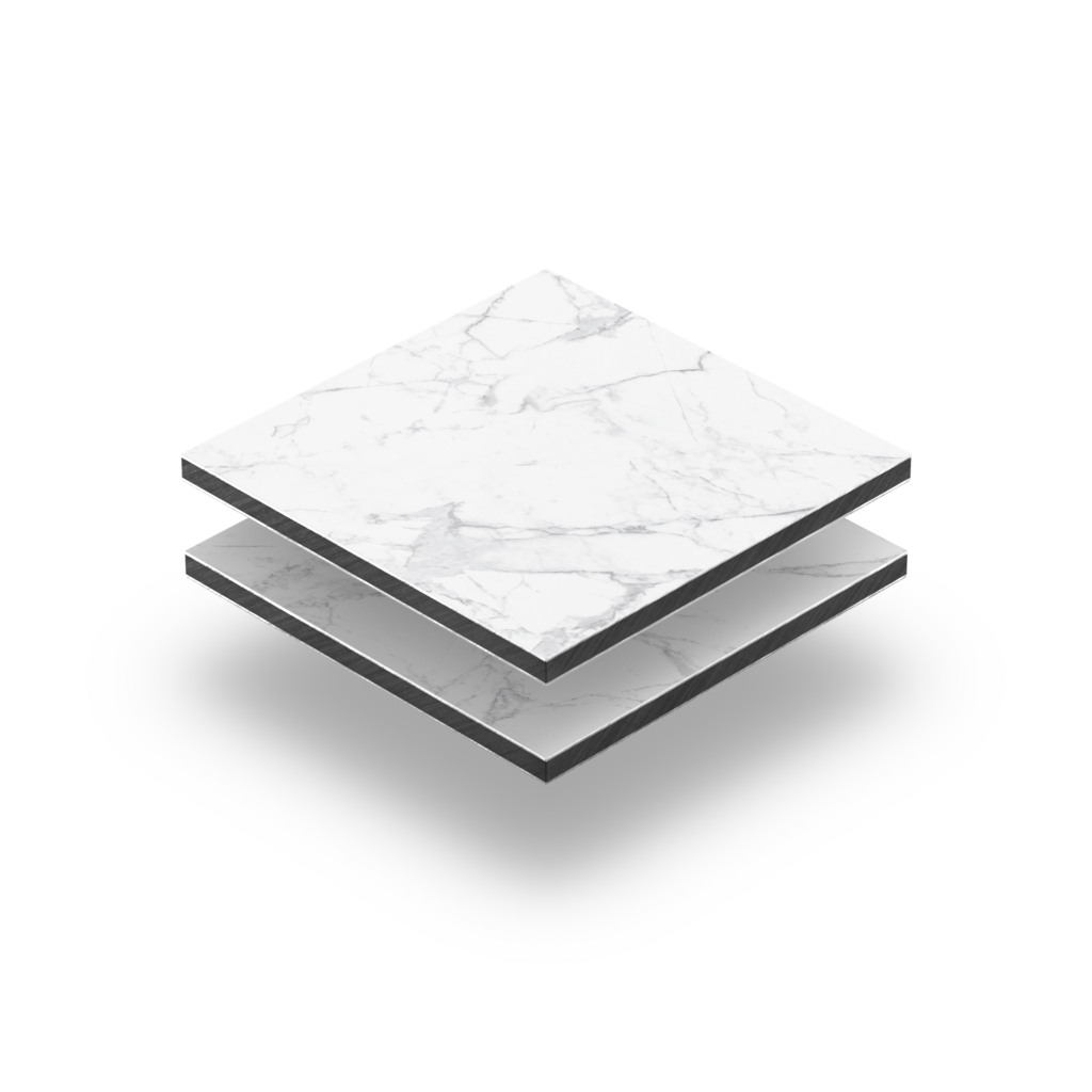 Deze wit marmer gekleurde Alupanel sandwichplaat bestaat uit een polyethyleen kern en twee toplagen van 0,3 millimeter dik aluminium. Deze toplagen zijn zeer duurzaam en verdragen diverse chemicaliën als zuren, basen, oliën en sterke oplosmiddelen. Aluminium composiet platen kunnen uitzetten of krimpen bij wisselende temperaturen. Je kunt de plaat gebruiken in temperaturen van -40°C tot +80°C. De plaat zet 0,24 mm per strekkende meter uit wanneer de plaat 10 graden opwarmt.