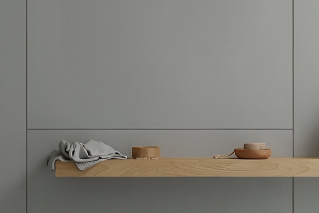 HPL (High Pressure Laminate) is een uitstekend materiaal voor een douchewand — en dat is allang geen geheim meer in de professionele bouw. De plaat is samengeperst uit kraftpapier en fenolhars, afgewerkt met een Nano-Technologie toplaag die vocht, vuil en uv-straling afweert. De stofgrijze kleur (RAL 7037-indicatie) geeft je badkamer een moderne, stoere uitstraling, terwijl de fijn gestructureerde matte finish vingerafdrukken vrijwel onzichtbaar maakt. Doordat HPL platen leverbaar zijn tot standaard 3,05 x 1,53 meter, is een naadloze douchewand uit een of twee stukken heel goed mogelijk — een groot voordeel ten opzichte van tegels met voegen. De plaat heeft 10 jaar garantie op kleurechtheid en delaminatie.