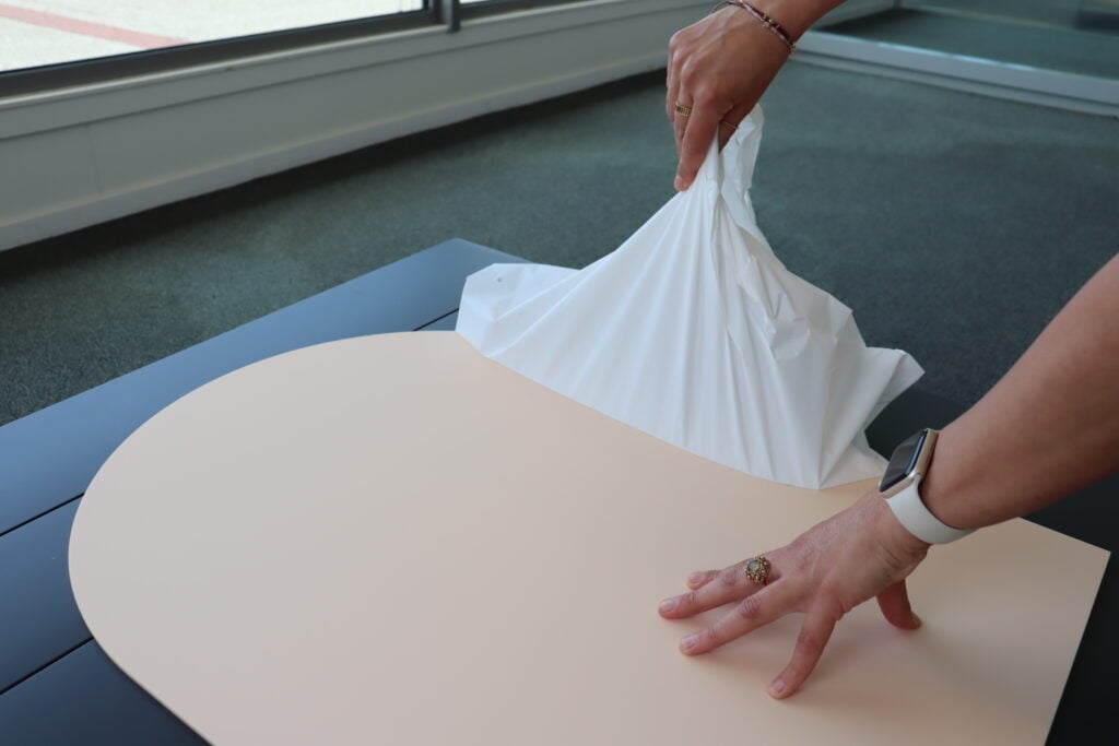 Bij ontvangst van de plexiglas plaat haal je voorzichtig de beschermfolie van de kant waar je de sticker wilt plakken. Trek de folie langzaam en gelijkmatig los om beschadigingen te voorkomen. Maak daarna de plaat schoon met een microvezeldoek en een klein beetje water. Dit is een belangrijke stap. Als er stof of vet op de plaat zit, hecht de sticker niet goed. Zorg dat alles volledig droog en schoon is voordat je verdergaat.