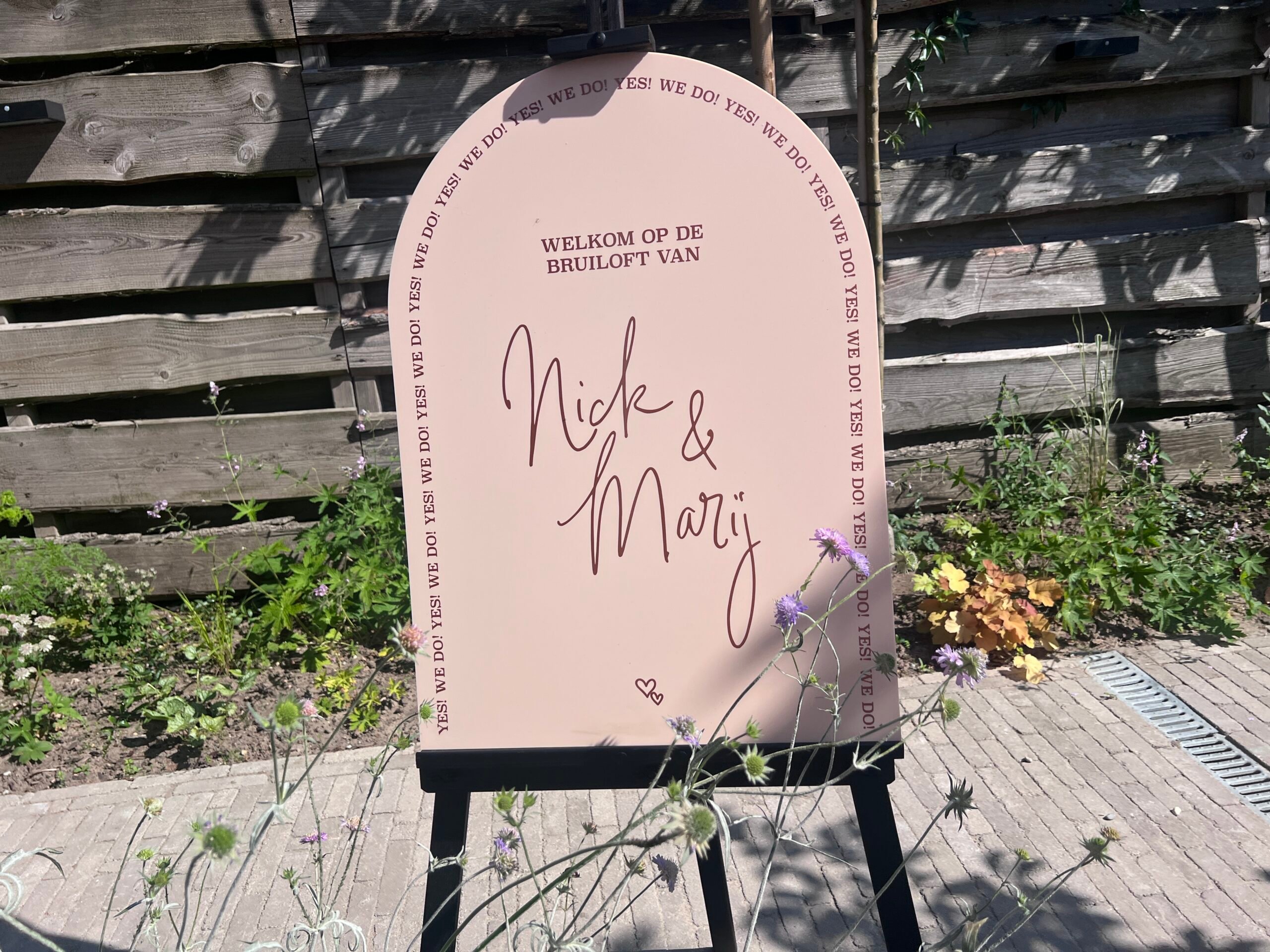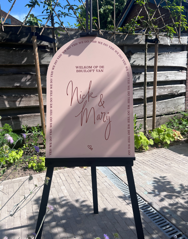 Ben je tevreden? Dan is het tijd om het bord op de perfecte plek te zetten. Kies een locatie die opvalt, zoals de ingang van de trouwlocatie. Zo krijgen gasten direct een warm gevoel als ze binnenkomen.