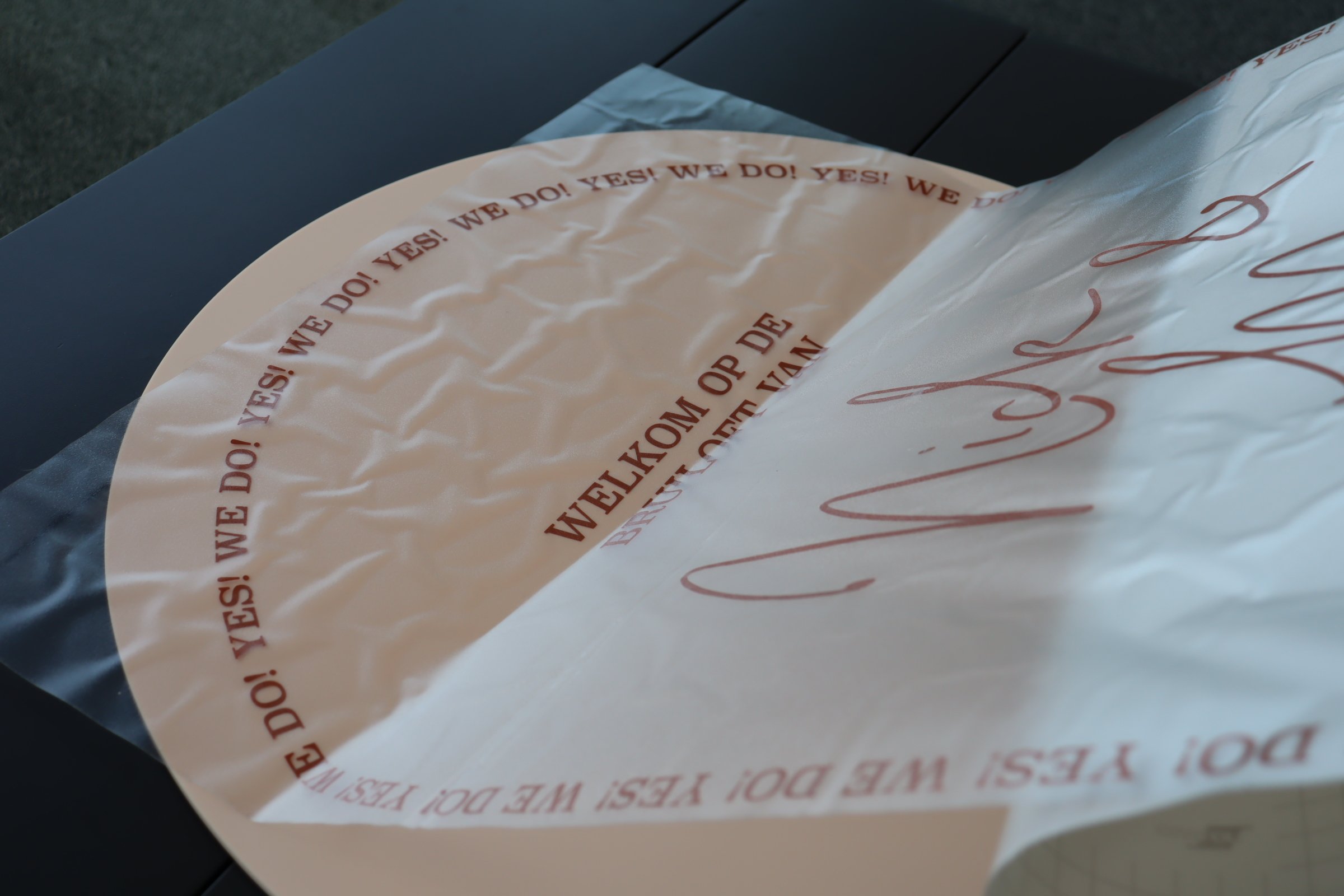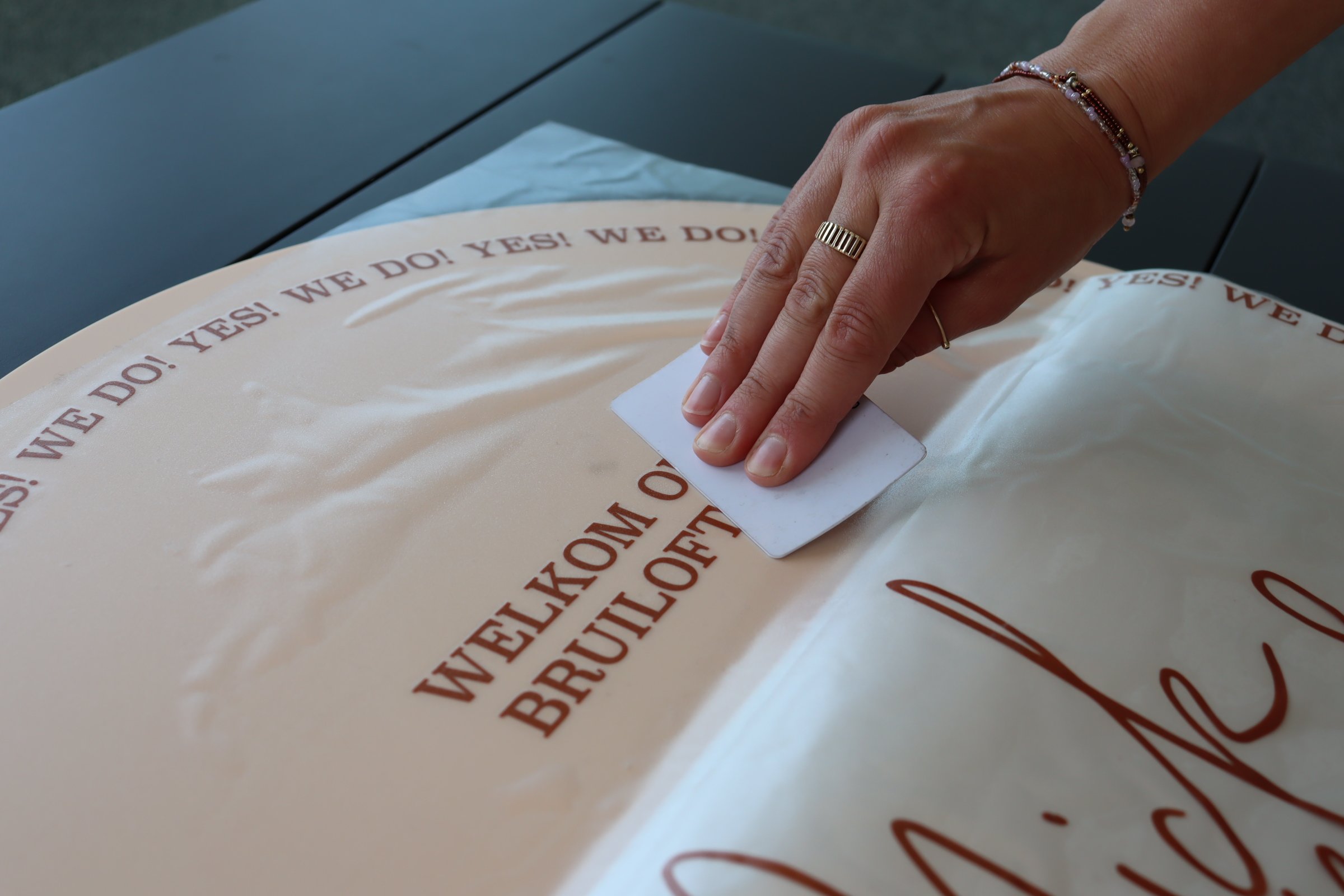 Voor je het bruiloft welkomstbord naar de locatie brengt, doe je een laatste check. Kijk of er geen stof, vlekken of lijmresten op zitten. Poets het plexiglas licht op met een microvezeldoek, zodat alles er strak uitziet. Controleer ook de sticker: zit deze mooi egaal en stevig vast? Controleer tegelijk de bevestiging van eventuele decoraties.