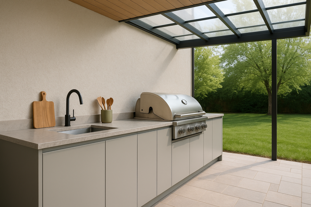 Gebruik UV-bestendige platen zoals plexiglas of polycarbonaat. Deze materialen houden je buitenkeuken beschermd tegen zon en regen.
