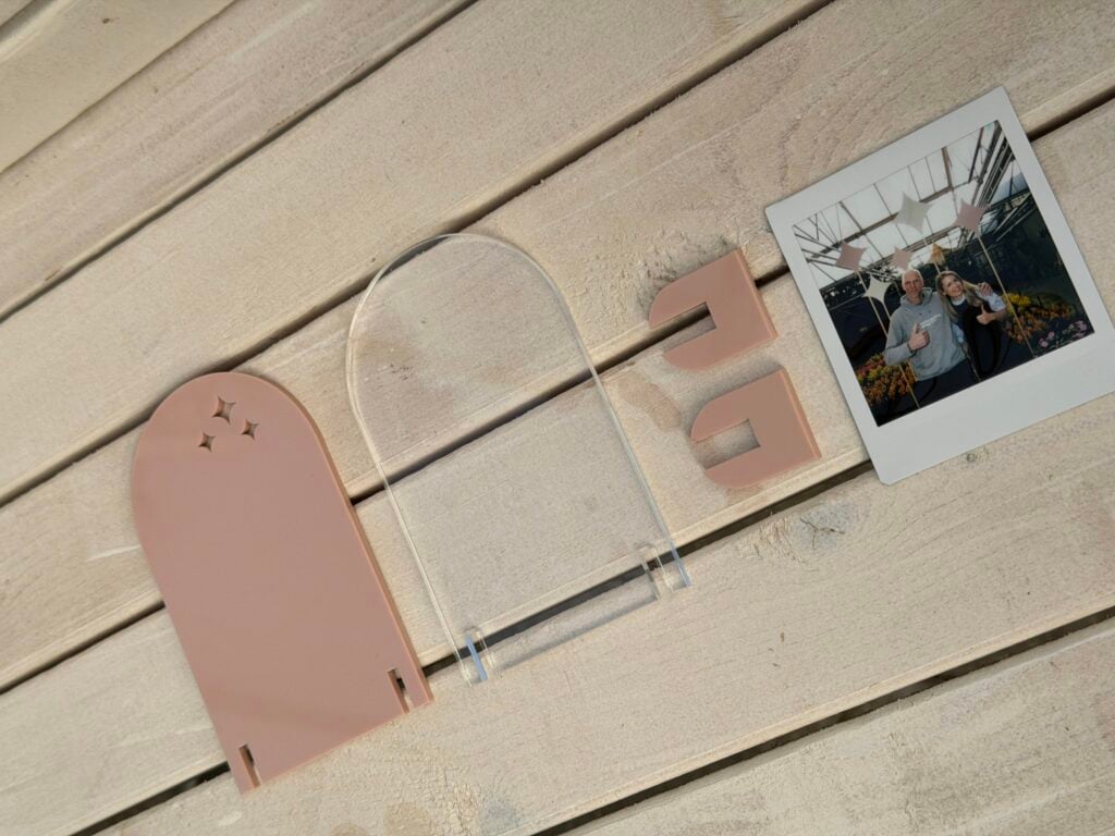 Wij hebben de fotolijst gemaakt met roze plexiglas, perfect afgestemd op het kleurpalet van een trouwfeest. Het prachtige ster-accent in de lijst zorgt voor een unieke touch.