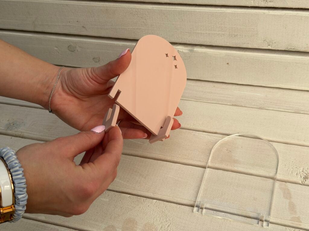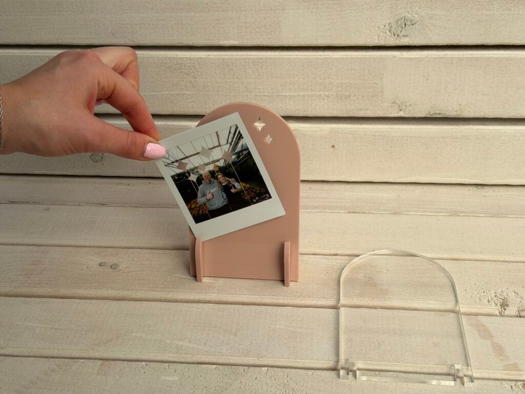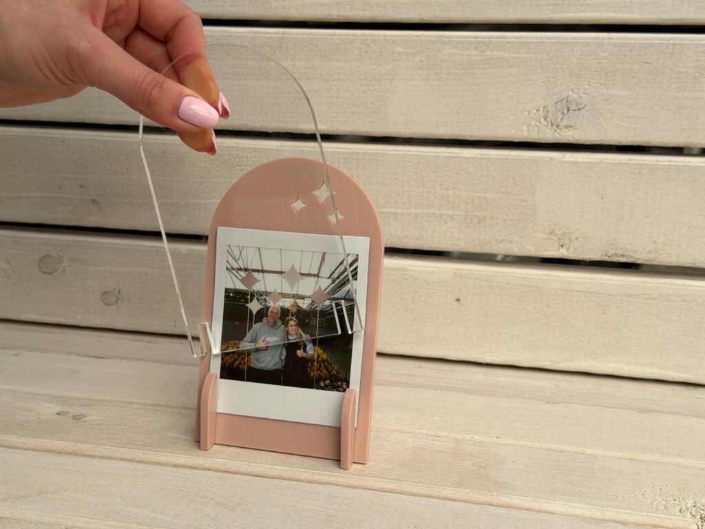 De polaroid fotolijst bestaat uit drie delen: het doorzichtige voorplaatje, een gekleurd achterplaatje, én de pootjes. De pootjes ontvang jij in één deel, je kunt ze gemakkelijk losbreken in tweeën. Download de designs (dxf-bestanden) zodat je deze gemakkelijk in de platenconfigurator kunt uploaden.